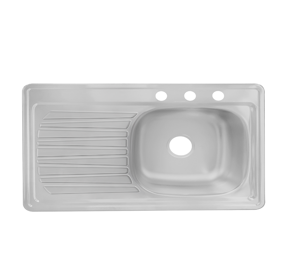 Este modelo es ideal para cocinas que buscan un diseño funcional con el escurridor en el lado derecho, optimizando el espacio y facilitando las tareas de lavado y secado en la cocina.